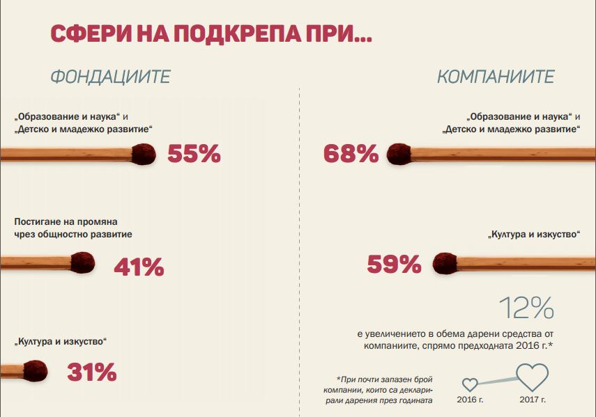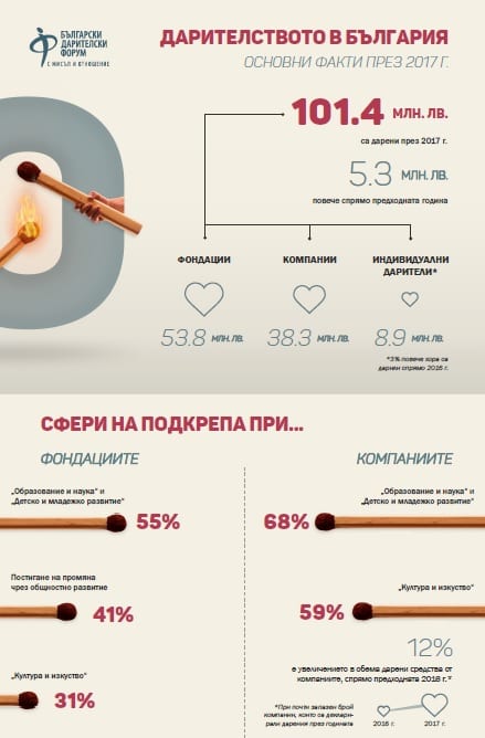 Ръстът в сравнение с предходната 2016 г. е малко над 5 млн. лв. Най-много средства през 2017 г. са дарили фондациите – 53,8 млн. лв., следвани от компаниите с 38,3 млн. лв. И компании, и фондации на първо място даряват за проекти, свързани с образование и наука, и детско и младежко развитие – общо над 54 млн. лв.