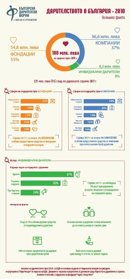 С 54,8 млн. лв. или 55% от общите дарени средства фондациите са най-големите дарители в България и през 2018 г. Тази тенденция е стабилна през последните пет години. Доста по-назад са компаниите с 36,6 млн. лв., инвестирани в общественозначими каузи. Малко над 8,3 млн. лв. са дарили през миналата година физически лица.