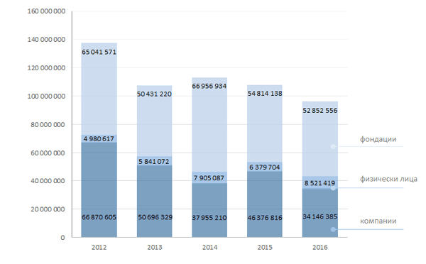 И през 2016 г., в продължение на тенденцията от 2015 г., най-голям дарител на финансови средства са фондациите, а на второ място са компаниите. Даренията от индивидуални дарители (физически лица) се нареждат на трето място.