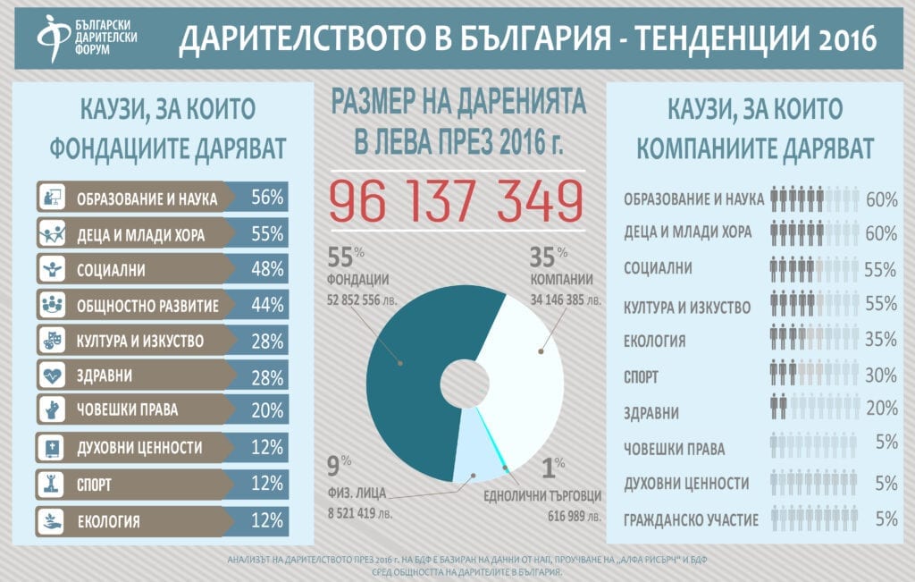 Общата дарена сума от фондации, компании, еднолични търговци и физически лица през 2016 г. е 96 137 349 лв. Спрямо 2015 г. се отчита спад в общия обем дарения с 11% (или с почти 12 млн. лева по-малко в абсолютна стойност).