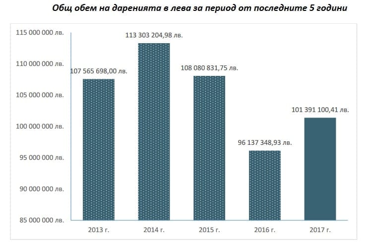 Ръстът в сравнение с предходната 2016 г. е малко над 5 млн. лв. Най-много средства през 2017 г. са дарили фондациите – 53,8 млн. лв., следвани от компаниите с 38,3 млн. лв. И компании, и фондации на първо място даряват за проекти, свързани с образование и наука, и детско и младежко развитие – общо над 54 млн. лв.
