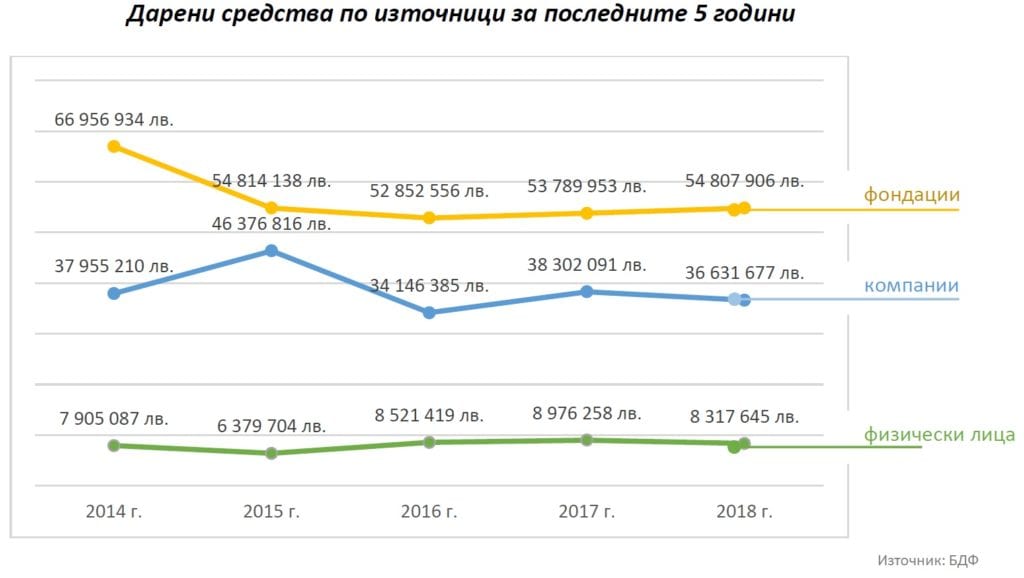 С 54,8 млн. лв. или 55% от общите дарени средства фондациите са най-големите дарители в България и през 2018 г. Тази тенденция е стабилна през последните пет години. Доста по-назад са компаниите с 36,6 млн. лв., инвестирани в общественозначими каузи. Малко над 8,3 млн. лв. са дарили през миналата година физически лица.