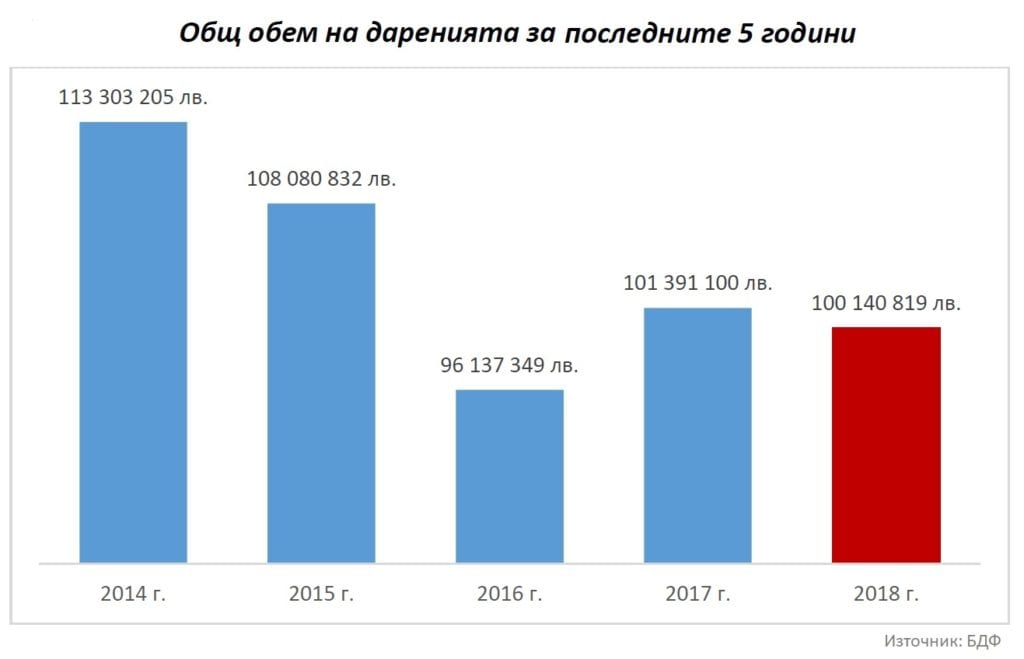Общо 100 140 819 лв. са дарените средства в България през 2018 г. Тази сума е с 1,25 млн. лв. по-малка от даренията през 2017 г.