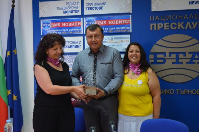 На снимката: В знак на признателност през 2015 г. председателката на фондация „Искам бебе“ Радина Велчева (вляво) връчи на инж. Емануил Манолов статуетката „Ангел на благодарността”.