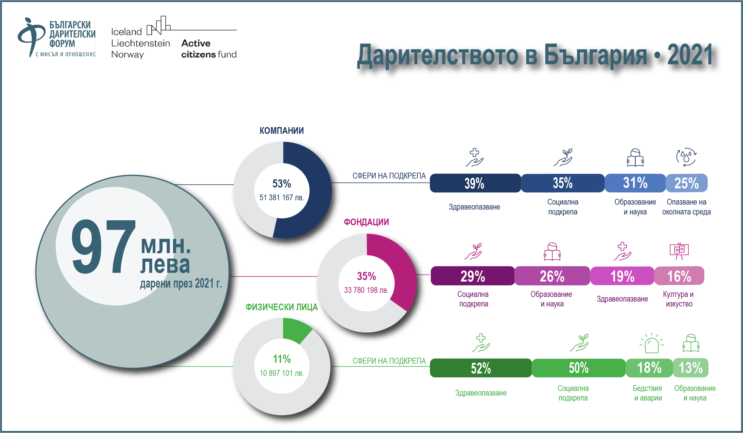 Годишният анализ на Български дарителски форум (БДФ) показва, че сумата, дарена от частни дарители през изминалата 2021 г., е 96 616 384 лева. В сравнение с 2020 г. се наблюдава намаление от 18% в общия обем дарени средства или с 20,7 млн. лева по-малко. Обичайно след година на силна дарителска активност, в която има сериозна природна или хуманитарна криза (каквато беше трудната 2020 година, белязана от COVID – 19), идва спад на дарителската енергия и 2021 г. илюстрира именно това. Дарителите продължиха да подкрепят каузи, свързани с преодоляване на негативните и дълготрайни последствия от пандемията в различни обществени сфери.
