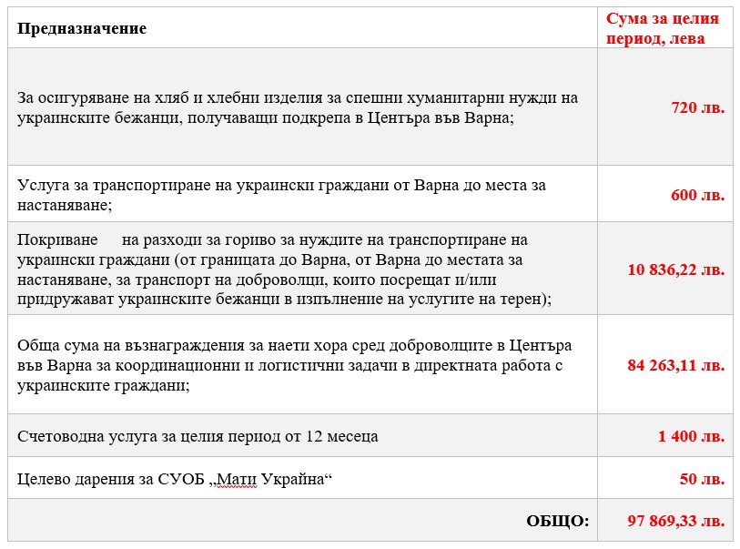Общо постъпили дарения (за периода 14 март 2022 г. – 31 март 2023 г.) са в размер на 97,869.33 лева