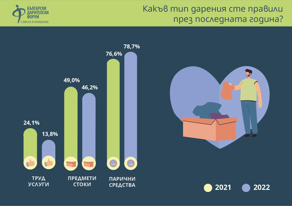 Най-често през 2022 г. дарителите са предоставяли финансова подкрепа. Освен пари, българите правят и материални дарения (дрехи, одеяла, строителни материали, хранителни пакети), а трети полагат и доброволен труд.
