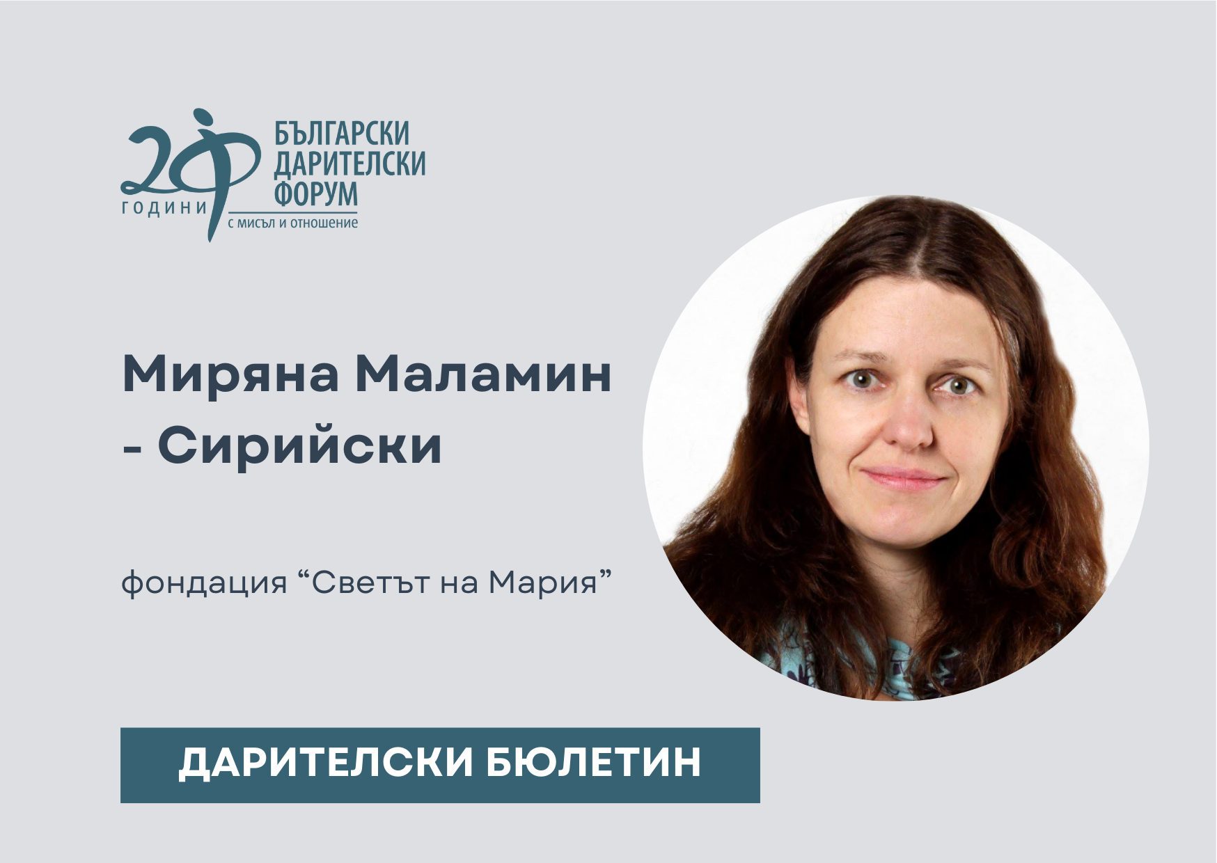 Миряна Маламин – Сирийски e експерт с 20-годишен опит в социалната сфера и директор на фондация „Светът на Мария”. Организацията подкрепя млади хора с интелектуални затруднения и техните семейства. Обучава ги в трудови навици и житейски умения, за да могат да се реализират и да създават пълноценни отношения със света. Към фондацията има Дневен център и Защитено кафене, както и социално предприятие „Бон Апети”, което предоставя качествен професионален кетъринг за събития.