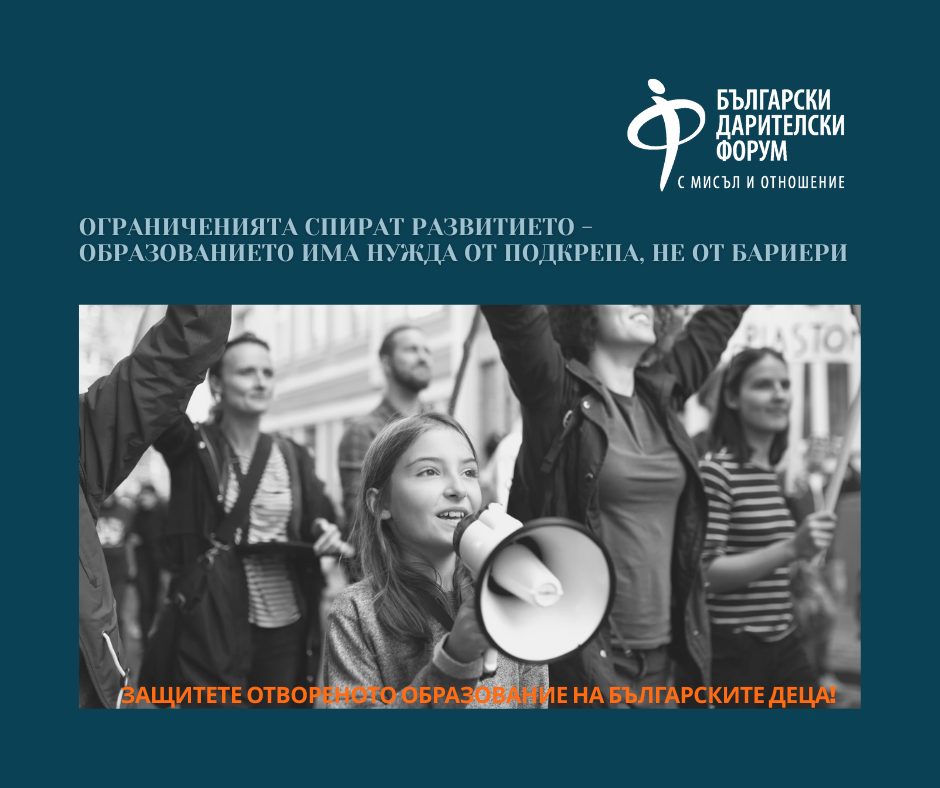 Българският дарителски форум (БДФ) изразява категорично несъгласие с предложението за изменение на чл. 348 от Закона за предучилищното и училищното образование (ЗПУО), което предвижда имуществени санкции за „физически или юридически лица, които организират и провеждат обучения, анкети, изследвания на деца, ученици и педагогически специалисти в образователни институции, ако са юридически лица, регистрирани извън България, или повече от половината от приходите им са от чуждестранни физически или юридически лица.“