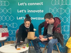 Петя Спасова от екипа на фондация „Светът на Мария“ и Дани, младеж от дневния център, демонстрираха как се правят купички от рециклирана хартия, а Дани разказа и повече за дейностите в ателие „Восък“. Двамата показаха как купичките стават чудесни съдове за засаждане на цветя, произведени от самите клиенти на центъра в специализирани оранжерии.