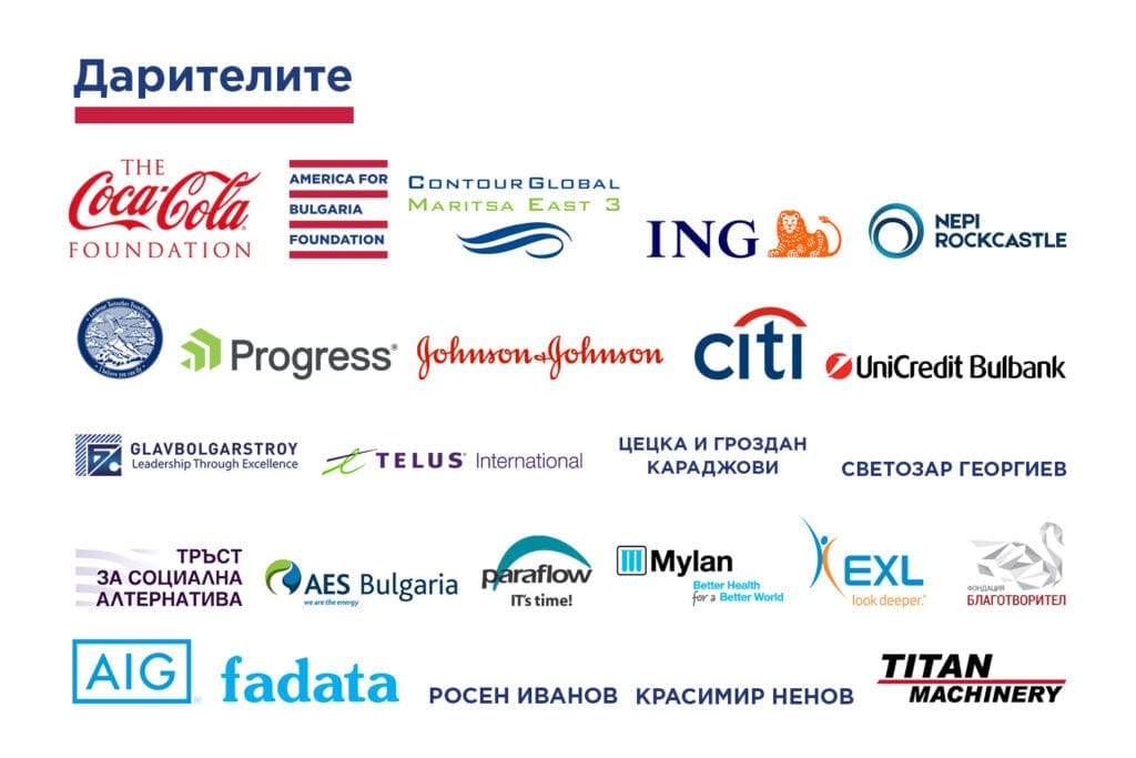 Инициаторите благодарят на щедрите дарители до момента: Фондацията на „Кока-Кола“, фондация „Америка за България“, „КонтурГлобал Марица Изток 3“, NEPI Rockcastle, фондация „Лъчезар Цоцорков“, ИНГ Банк Н.В., „Прогрес софтуер“, Ситибанк България, „Джонсън & Джонсън България“, УниКредит Булбанк, „Главболгарстрой холдинг“, TELUS International Europe, Цецка и Гроздан Караджови, Светозар Георгиев, фондация „Тръст за социална алтернатива“, „ЕЙ И ЕС – 3С Марица Изток 1“, „Парафлоу комуникейшънс“, „Майлан“, фондация „Благотворител“, AIG Europe S.A. (Bulgaria branch), „Фадата“, Росен Иванов, Красимир Ненов, „Тайтън машинъри България“, „И Екс Ел сървиз България“, клуб „Зелена стъпка“ и още шестима индивидуални дарители.
