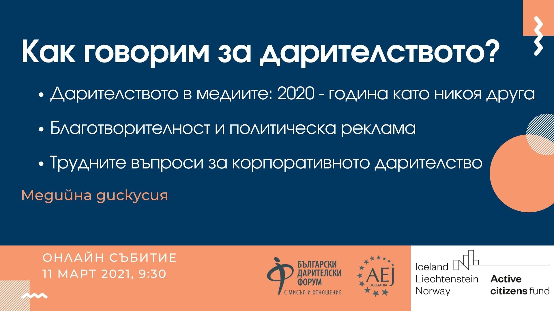 Дискусията “Как говорим за дарителството?” е подходяща за журналисти от национални и регионални медии. Освен възможност да научат най-новите данни за представянето на дарителството в България, както и какви са актуалните тенденции, участниците ще могат да споделят собствените си виждания и опит.